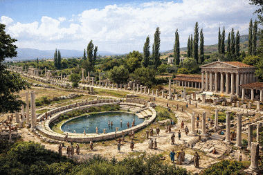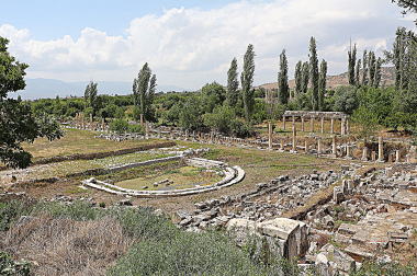 Bアフロディシアス(Aphrodisias)のローマ都市遺跡 左:現在のローマ都市遺跡 右:ローマ時代の想像図(作図ChatGPT) ![]() |