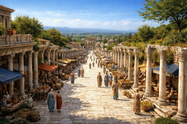 | @エフェソス列柱通り(デクマヌス・メインストリート) 左:現在のエフェソス・ローマ列柱通り遺跡 右:ローマ時代の列柱通り(メインストリート)の想像図(作成:ChatGPT) ![]() |