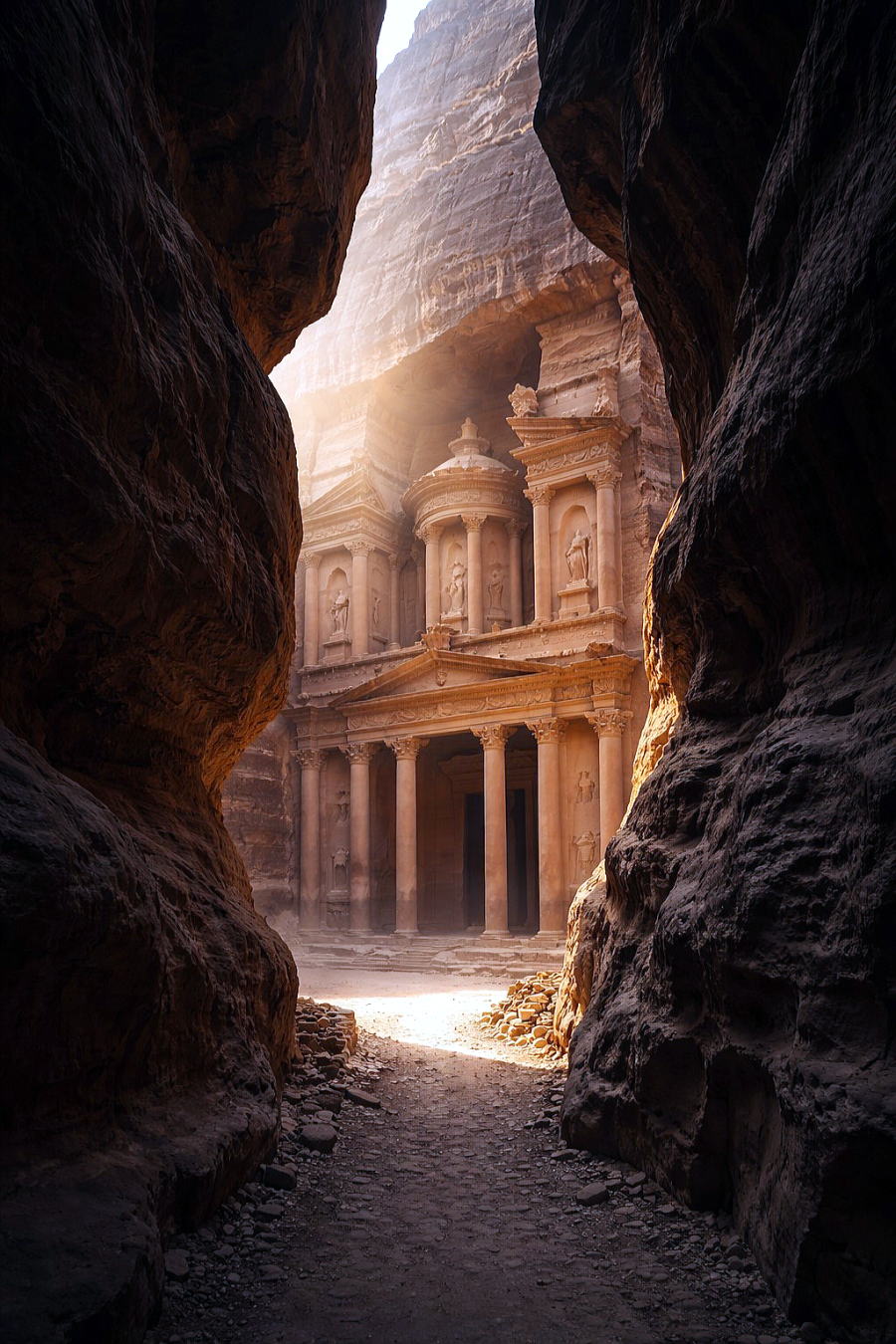 シークごし見える、朝日に輝くペトラ遺跡:エル・ハズネ |